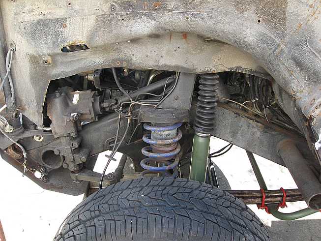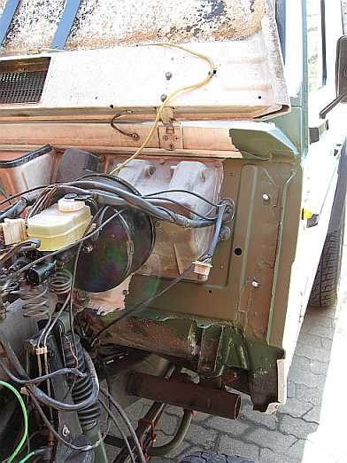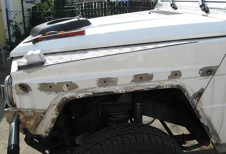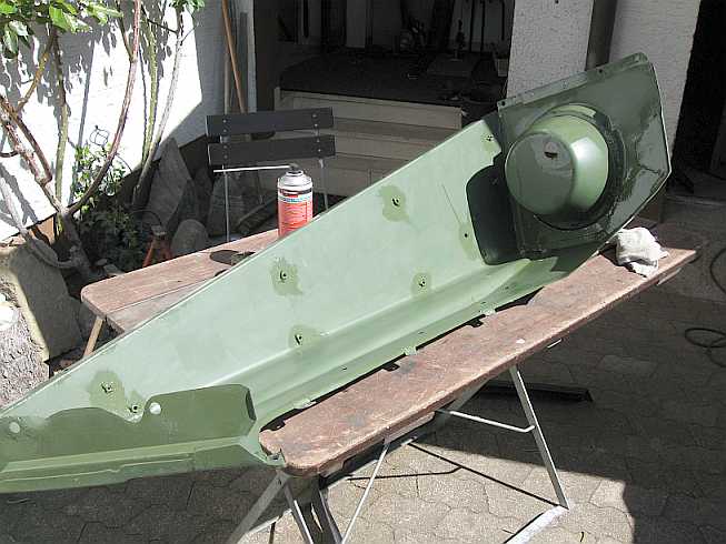 | Die meiste Arbeit ist das Entfernen des alten, verhärteten PVC-Unterbodenschutzes mit dem Heißluftföhn (Bild: rechter Kotflügel). Das Radeinbaublech wird vor dem Lackieren geschliffen. | ![]() |