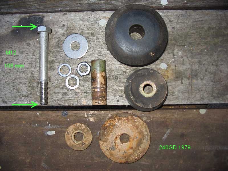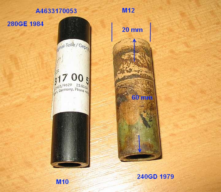 Bild-Nr. 11: 240GD, Abstandrohr: A4603170053 - 2,68 Euro ohne MwSt., Länge 60 mm, Außendurchmesser: 20 mm, Innendurchmesser: 13 mm für M12-Schraube. Das Abstandrohr A4633170053 - 4,80 ohne MwSt. (2. Bild, links) ist für die M10-Schrauben beim 280GE vorgesehen. | ![]() |