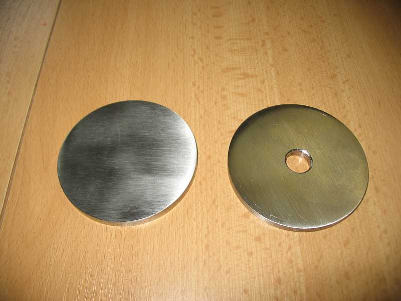 | Bei der Fa. Edelstahl-Trummler gibt es diese V2A-Scheiben (Ronden) ohne Bohrung für 2,10 Euro ohne MwSt. (70 mm, 6 mm stark). Das Mittelloch M12 muss man sich selber bohren. | ![]() |