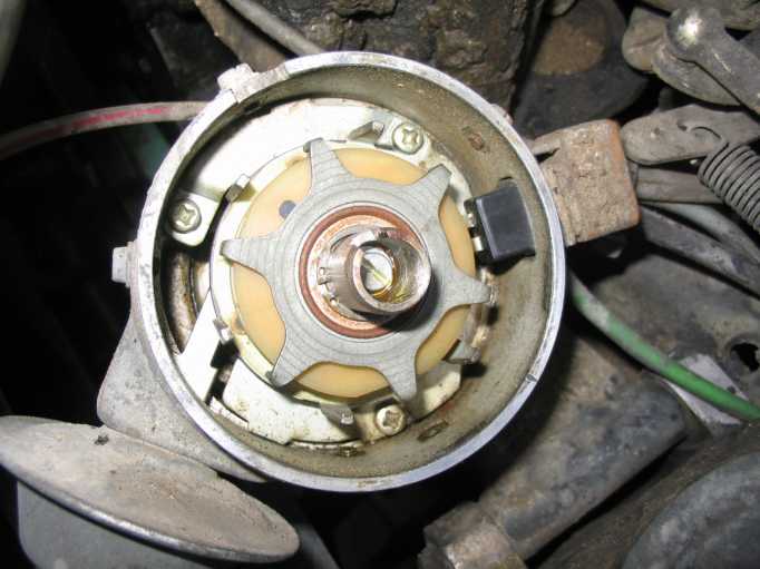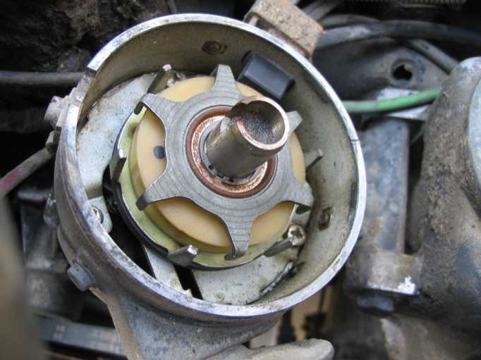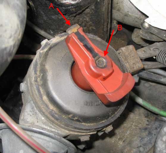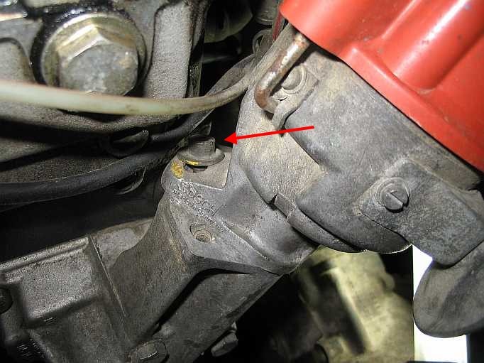 Einfacher ist die Einstellung auf 10 Grad vor OT. im Leerlauf bei 850 (+-50) Umdrehungen (warmer Motor). Die Gradeinstellung (Stellrad) auf 10 Grad einstellen und die Schwungscheibe anblitzen (gelben Knopf drücken). Die 0 Grad-Strich-Markierung auf der Schwungscheibe muß gegenüber der Spitze der OT-Markierung stehen bleiben. Sonst muß der Verteiler verdreht werden (Feststellschraube lösen: 5er-Inbus und lange Verlängerung). Hinweis von CGünther, 4x4-Forum: "Steht die im Blitzlicht sichtbare Markierung nicht still, sondern pendelt, dann hat die Verteilerwelle Spiel". |