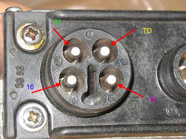 Belegung 4-polige Steckdose und Stecker: (Querschnitt-Farbe): 31 = Masse (1,5 br) 16: Klemme 1 Zündspule (1,5 sw) 15: Zündung ein (0,75 rt/sw) TD = Drehzahlsignal (0,75 gn/ge) |