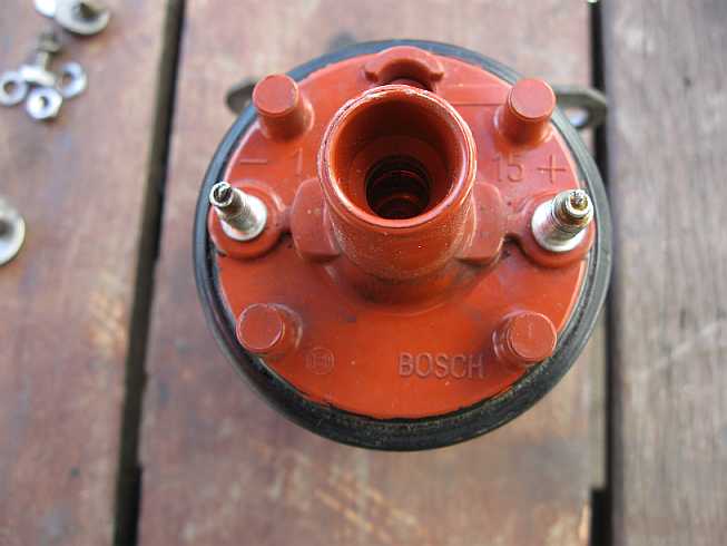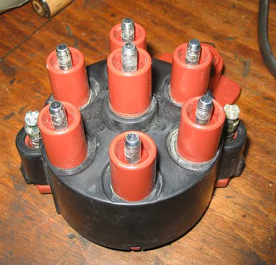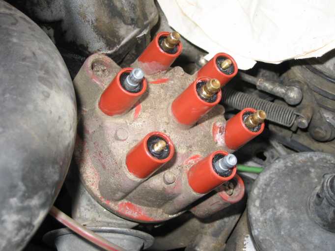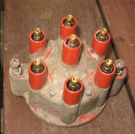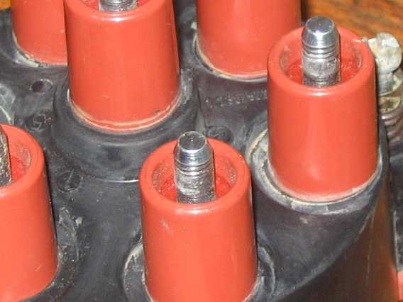 Die Steckanschlüsse für die Zündkabel am Verteilerdeckel waren korridiert. Von ausgedienten Zündkerzen passen die kleinen Messingmuffen. |