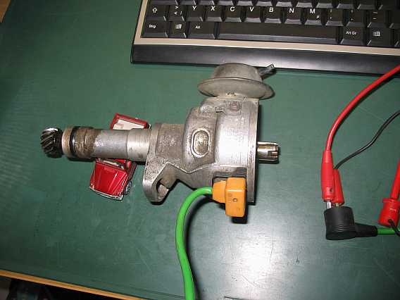 Dreht man einen ausgebauten Verteiler mit der Hand, kann ein USB-Speicheroszilloskop als Zusatzgerät zum Notebook die Signale des Hallgebers abspeichern. Mit einem kleinen Vielfachmessgerät (Zeigerinstrument) mißt man beim schnellen Drehen eine Wechselspannung von etwa 4 Volt an den beiden Anschlüssen am Verteiler (Steckerschraube abschrauben und Stecker abziehen). Ein Digitalvoltmeter zeigt etwas weniger an. |