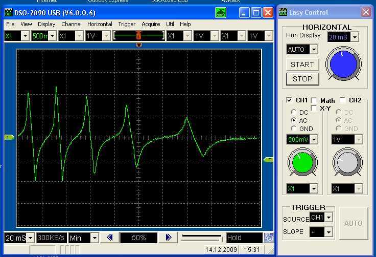 Bei etwa 1500 Umdrehungen (Leerlauf Motor kalt, 8 Grad C.) sind es 75 Hz. Der Kehrwert 1/75 ergibt die Zeitspanne für einen Zündimpuls: 0,0133 sec = 13,3 msec. |