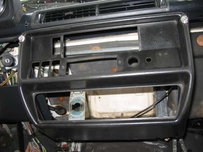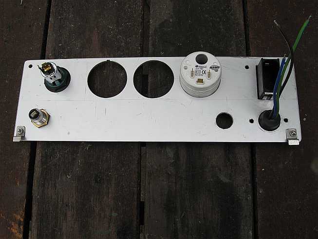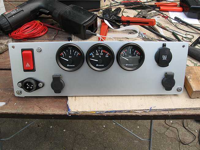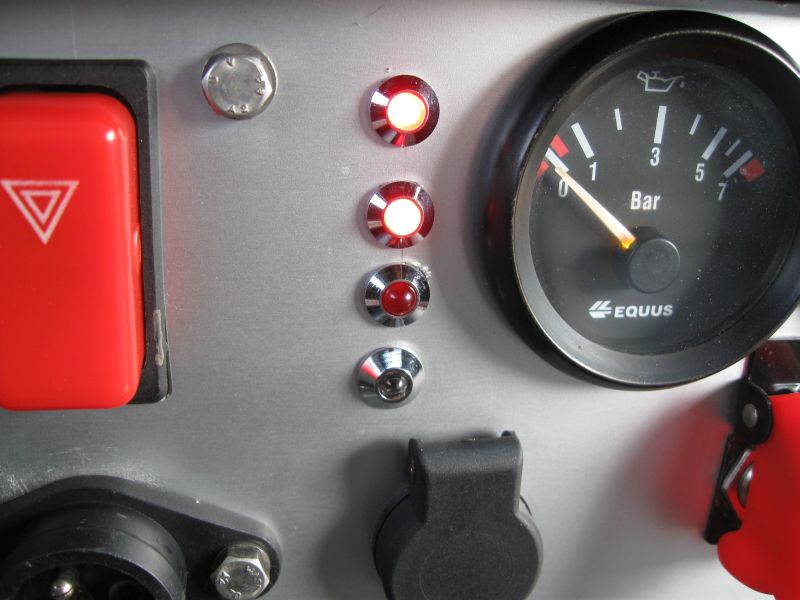 In der neuen Anzeigetafel des Armaturenbretts sind in der Mitte die drei Anzeigeinstrumente. Links daneben sitzt der Warnblinker. Darunter ist die Buchse für die Seilwindenfernbedienung eingebaut und eine Kfz-Steckdose (Klemme 15). Eine große Steckdose und eine Kfz-Steckdose bekommen Dauerplus. Die Anzeigeplatte ist über eine Steckleiste abklemmbar. |