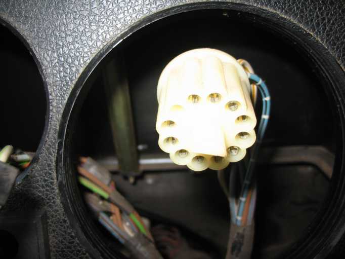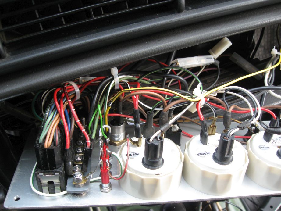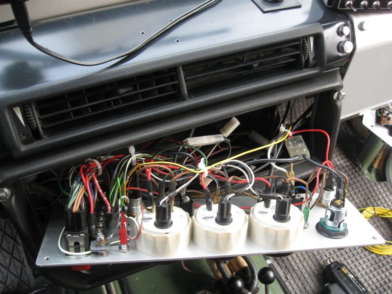 | Das 3. Bild zeigt die Probeverdrahtung. Eine eigene Masseleitung führt zum zentralen Massepunkt links vom Lenkrad. Die Leitungen zur Schalttafel sind gesteckt, ein Ausbau ist schnell durchgeführt: Vorhanden sind Öldrucksensor, Temperatursensor, Beleuchtung, 12V-Zündung (Zigarrenanzünder), 12V-Dauerplus (von Uhr), Masse, dreifach Steckdose Fernbedienung der Seilwinde. |