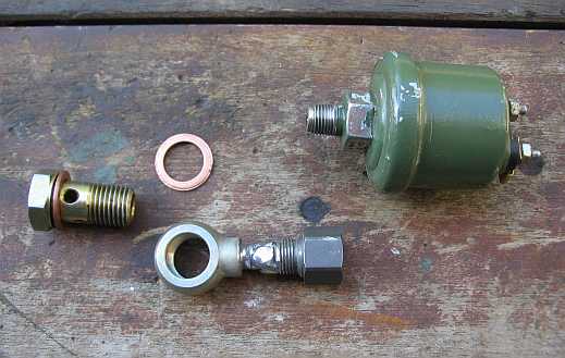 | Ein Messing-Bremsleitungsverbinder M10x1 passt auf den Druckgeber. Von einem M14x1,5-Schlauch-Winkeladapter (8 mm, Ringöse mit Hohlschraube) wird der Schlauchkonus abgesägt und an die Ringöse ein Bremsleitungsnippel M10x1 aus Stahl mit dem Sechskant angeschweißt. Ein Bremsleitungsbördel dient als Dichtung. Zusätzlich wird mit Teflonband abgedichtet. |