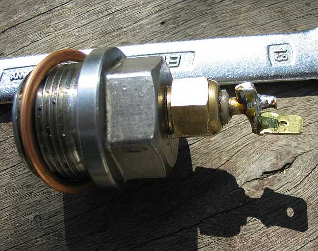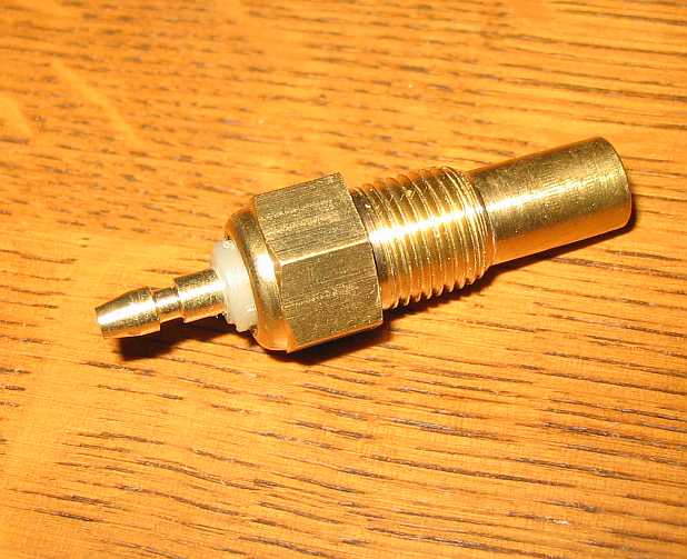 Da es keinen M26x1,5 - Temperatursensor/Geber wie damals beim 240GD mehr gibt, muß in eine Sechskant-Verschlussschraube mit Bund, M26x1,5 zyl. Feingewinde DIN 910, Stahl 5.8 verzinkt, ein passendes Gewinde (ich verwendete M10x1) für den Sensor geschnitten werden (Tipp von Carsten Günther: www.gclub-koeln.de). |