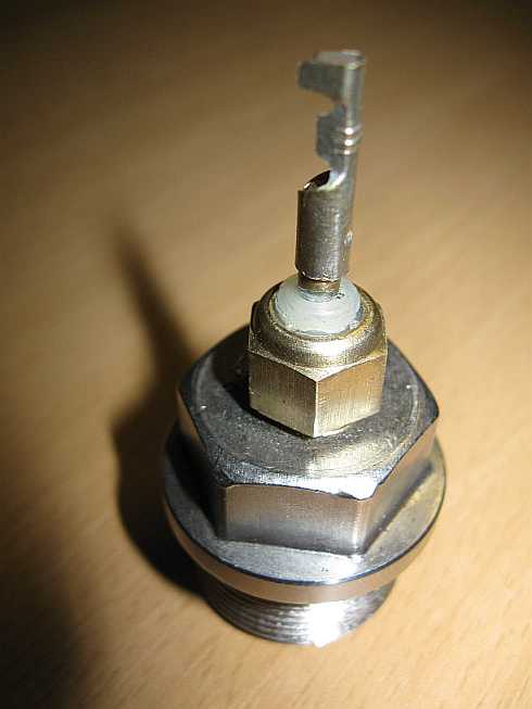 | Da der Sensor von Fa. Equus den selten verwendeten Rundstift-Anschluss hat, habe ich einen Flachsteckeranschluss aufgepresst und verlötet. | ![]() |