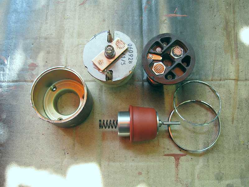 | Beim Zerlegen des Anlassers war klar, ein Austauschanlasser ist für die nächsten Jahre die bessere Wahl. Probeweise ölte ich mal die beweglichen Teile. Vor allen Dingen gefiel mir der Kollektor des Motors nicht. Auch die Gleitlager des Motors waren verschlissen. Zum Fotographieren zerlegte ich den Anlasser dann nochmal ;), bevor er zu Mercedes im Austausch kam. |