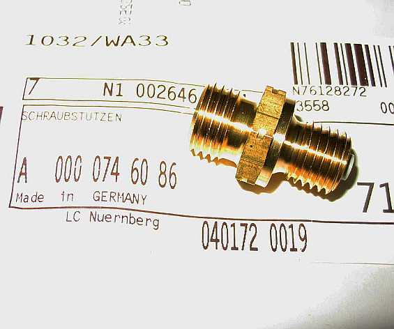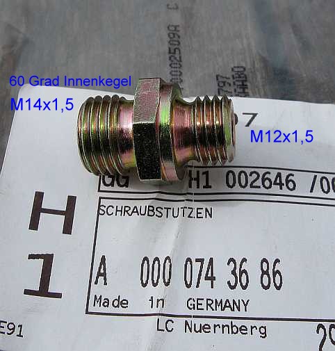 Schraubstutzen: mit 60 Grad-Innenkegel Schraubstutzen Außengewinde: M14x1,5 - 60 Grad-Kegel / M12x1,5 : Kraftstoffzufuhr mit Filter: A000-074-6086 - 3,85 Euro ohne MwSt. |
