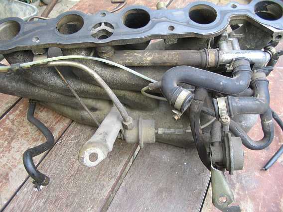 | Interessant sind die Verbindungen zwischen den Ansaugkanälen für den Leerlauf. Der Anschluss in der Mitte der Kanäle führt mit dem Schlauch A110-094-1682 zum Leerlaufluftverteiler. | ![]() |
