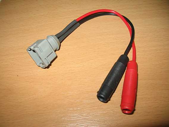 | Der Stecker (Kupplung) A 116 540 0181 - 9,84 Euro ohne MwSt. ist der gleiche wie beim Kaltstartventil. Er hat die Einsätze A 003 540 02 26 - Euro ohne MwSt.. Zum Messen habe ich mir einen Adapter gebaut (passt auch ans Kaltstartventil). Die Halteklammer am Teststecker habe ich entfernt. | ![]() |
