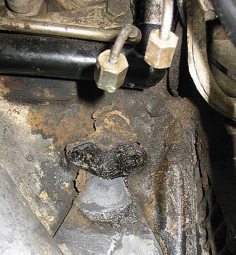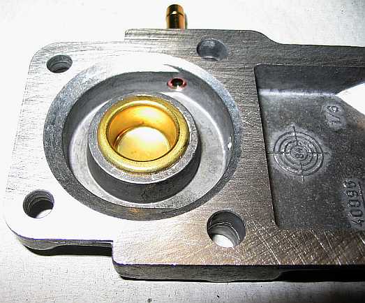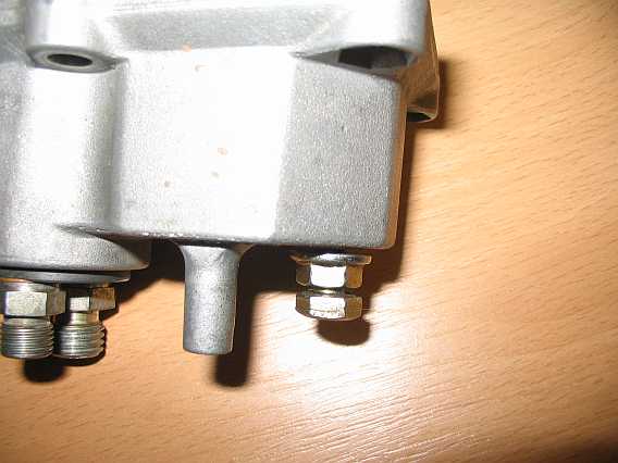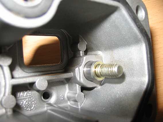 | Nun wird mit einem kleinen Hammerschlag auf die Schraube der Bolzen tiefer gesetzt, so dass die Mutter am Gehäuse anliegt. Zum Justieren des nun zu niedrigen Startsteuerdrucks wird durch vorsichtiges Anziehen der Mutter der Bolzen wieder etwas herausgezogen, bis der Startsteuerdruck stimmt (siehe Steuerdruck messen). Bei 0,5 mm tiefer eingeschlagenem Haltebolzen lag der Startsteuerdruck um 0,3 bar niedriger (bei 0,6 bar schlechter Motorleerlauf). | ![]() |