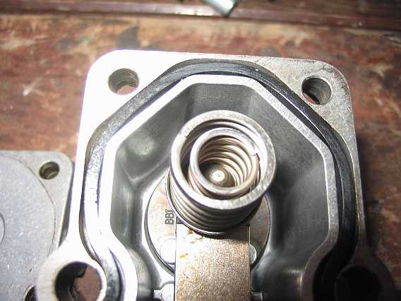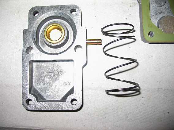 | Eine große und eine kleinere Feder drücken über eine Druckscheibe ("Hütchen") und einen Druckbolzen auf das Flachsitzventil. Der Fusspunkt der inneren kleinen Feder ist unterdruckabhängig verschiebbar. Damit wird die Gesamtcharakteristik der beiden Federn etwas geändert. |