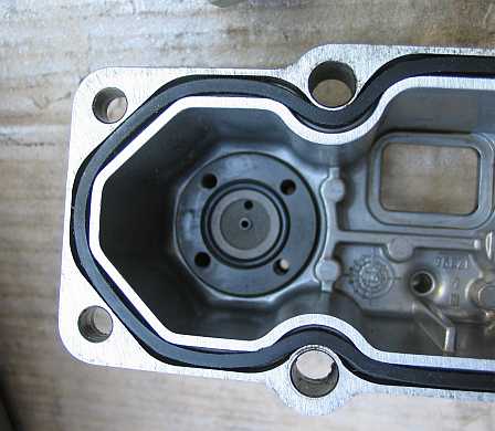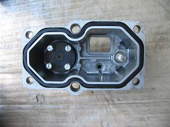 Die umlaufende Gummidichtung ist zusammengepresst und dichtet nicht mehr ab. Ersatz gab es nicht. Ich legte in die Gehäusenut eine dünnen Hanfschnurr ein und gab Dichtungsmasse (Ölwannenflüssigdichtung) hinzu, darauf kommt die Gummidichtung. Sie ragt nun etwas aus der Nut heraus. Inzwischen gibt es die Vierkanntdichtung als Ersatz bei www.ferrari400parts.com, z.B. auch die Dichtung des Warmlaufreglers. |