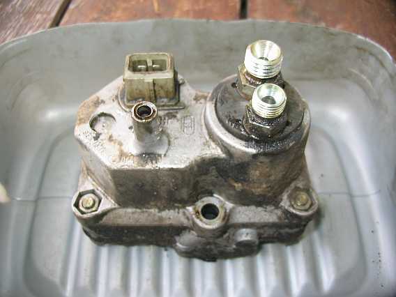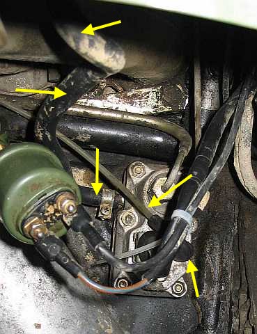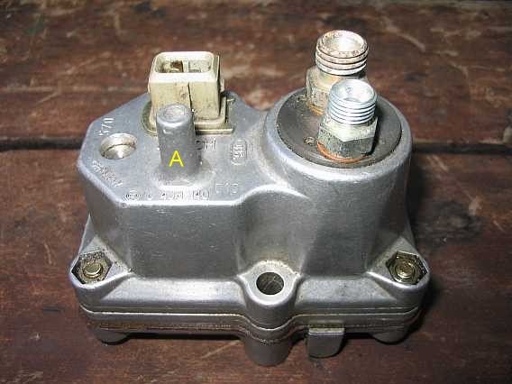 a) obere größere Kammer mit Unterdruck-Anschluss oben am WLR: Die dickere Gummileitung führt zum Anschluss am Saugrohrboden nahe beim 6. Zylinder. b) untere kleine Unterdruckkammer mit seitlichem Unterdruckanschluss: Die dünne Kunststoffleitung führt zum Schlauch am Zusatzluftventil. Dient nur der Sicherheit, damit bei Undichtigkeit des Flachsitzventils das Benzin abgesaugt wird. |