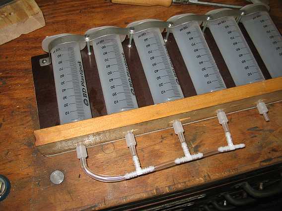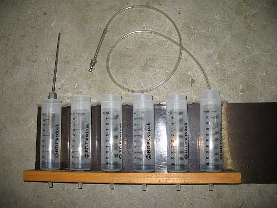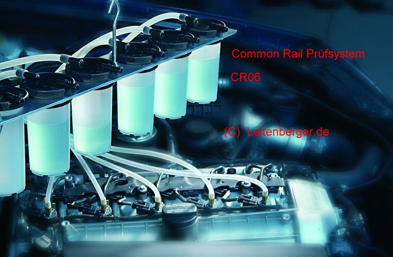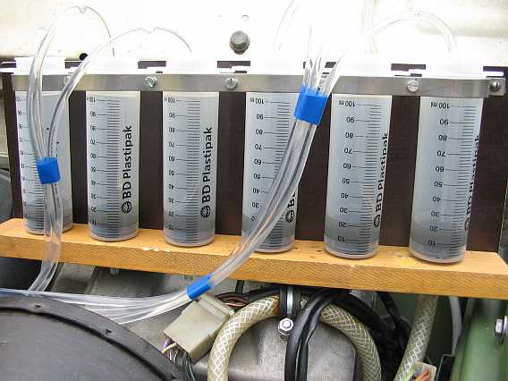 Die Common-Rail-Prüfsysteme, z.B. das der Fa. Leitenberger/Autotestgeräte, ermöglichen die Bestimmung der Rücklaufmenge der Injektoren. So ein ähnliches Prüfsystem kann man für den Mengenteiler beim 280GE auch selber bauen. Dazu benötigt man einen Satz Metall-Benzinleitungen, sechs benzinfeste 100 ml Einmalkunststoffspritzen (BD Plastipak, Polyethylen) mit Skalierung sowie 6 mal einen Meter eines Kunststoff-Benzinschlauches (6 mm Außendurchmesser) als Leitung zu den Messbechern. |