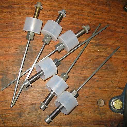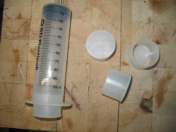 | Ein passend gebogener Metallstreifen mit Verschraubungen hält die Zylinder an der Rückwand fest. Mit der Kanüle am Boden des Zylinders stecken sie in Löchern im Bodenbrett. | ![]() |