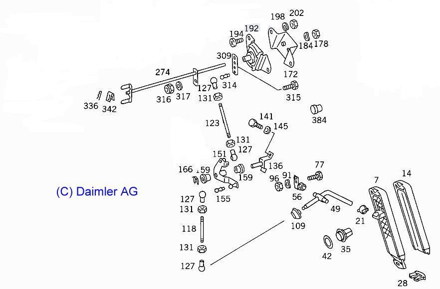 Nr. 127 Kugelpfanne: A000990461 (alt: A000-991-8922) Nr. 56 Gelenkstück/Gaspedal: A1233010022 Nr. 109 Dichtung/Spritzwand/Gaspedal: A1233010497. Büchse: A1102910750 Lagerbock: A4603000136 K lammer (Clip für Gaspedal): A1249888678 |