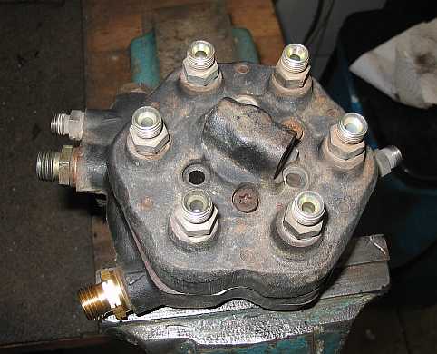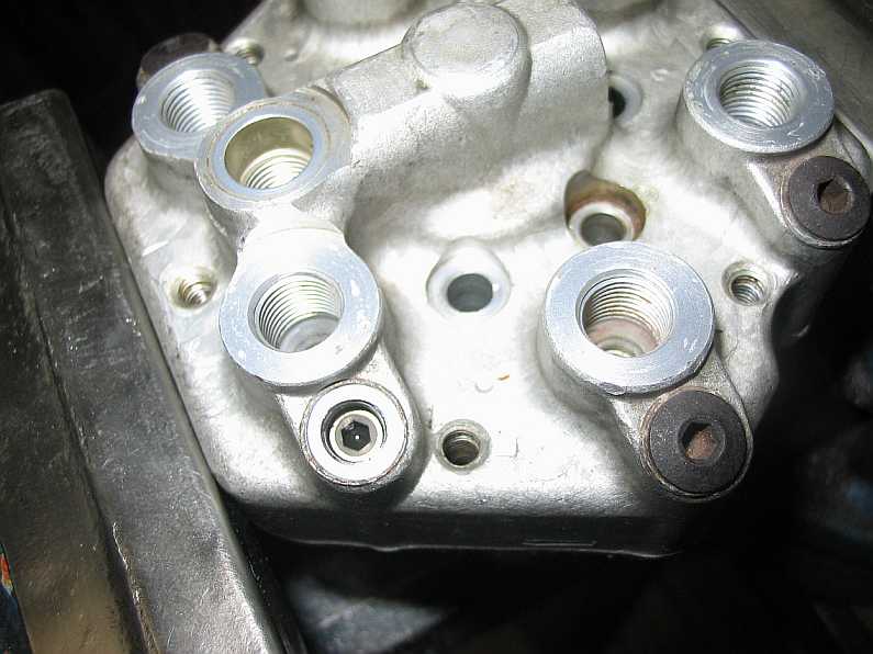 | Sechs Einspritzleitungen führen zu den sechs Einspritzdüsen (siehe Bericht). Neben den Schraubstutzen für die Einspritzleitungen sind sechs Verschlussschrauben (3,5 mm Inbus). Die darunter liegenden Einstellschrauben für die Differenzdruckventile sind ab Werk eingestellt und sollten nicht verstellt werden. Man benötigt zur Einstellung einen Mess-/Testplatz mit einem Differenzdruckmanometer mit zwei Anschlüssen. | ![]() |