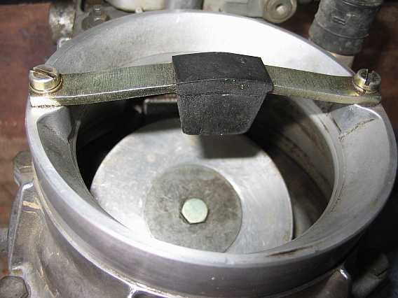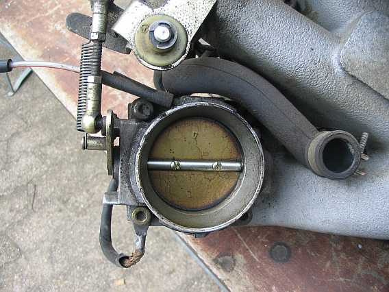| Die Unterseite der Drosselklappe kann auch mal gereinigt werden. Die Schlitzschraube für die Grundjustierung habe ich durch eine Schraube mit Kopf ersetzt, sie läßt sich später leichter verdrehen. | ![]() |