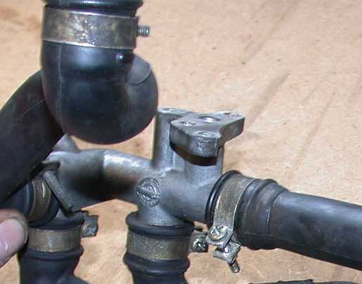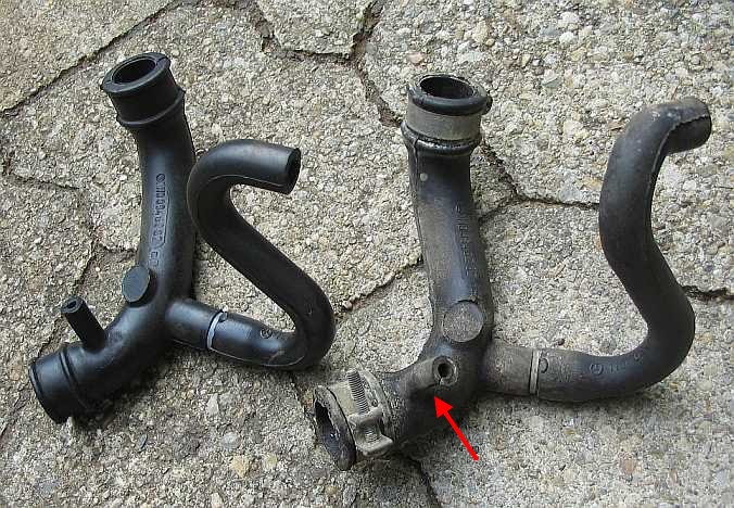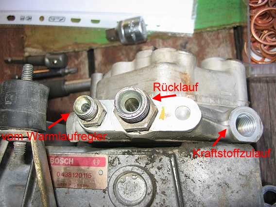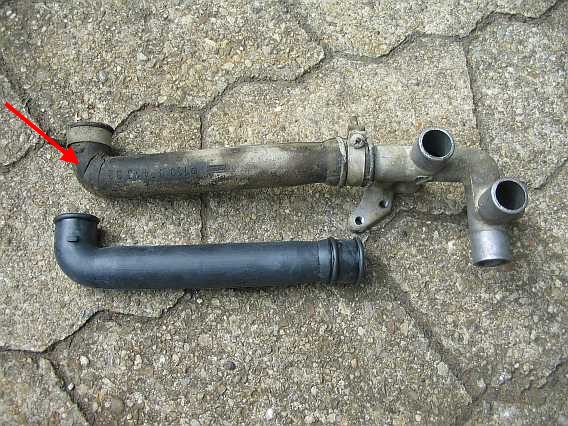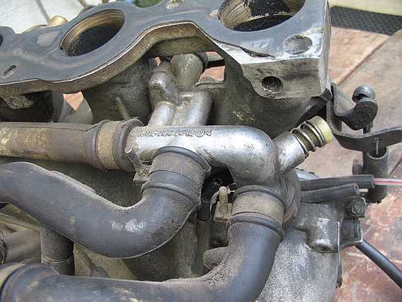 | Der schmale Anschluss dient zur Entlüftung (Leckleitung) und ist über einen Kunststoffschlauch mit dem Y-Verteiler am Bypass vor dem Leerlaufluftverteiler verbunden. | ![]() |