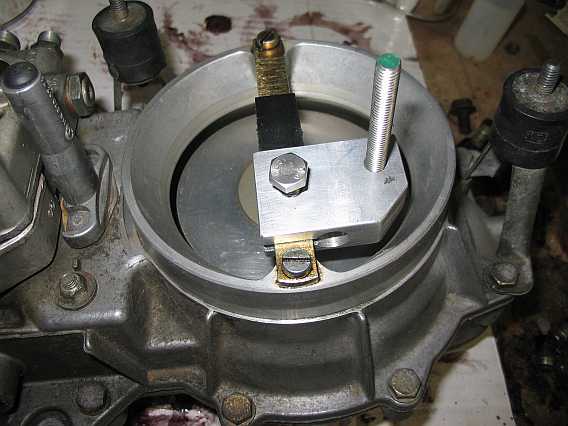 | Ein Hebelarm trägt auf der einen Seite die Stauscheibe, die andere Seite ist gabelförmig und trägt das Gegengewicht. Ein zweiter Hebelarm sitzt in der Gabel auf der gleichen Achse. Er drückt mit einer Rolle auf den Steuerkolben. Auf der anderen Seite ist er mit einer Einstellvorrichtung mit dem Stauscheibenhebel verbunden. Damit wird bei Nulllage der Stauscheibe die Steuerkolbenstellung und somit das Gemisch eingestellt (siehe Leerlauf-Gemischeinstellung). | ![]() |