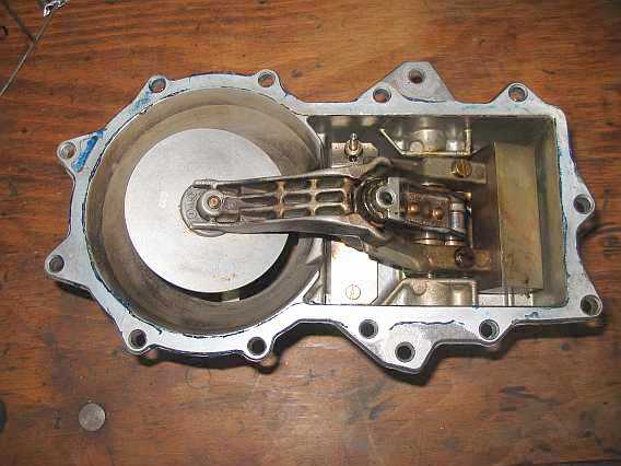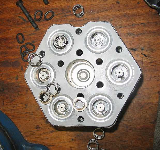 | Auf den Federn liegen die weißen Kunststoffventilteller. Darauf liegt die Membran, die Ober- und Unterkammer trennt und alles abdichtet | ![]() |