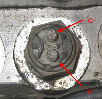 | Der Thermozeitschalter besitzt zwei Anschlüsse W und G. Der W-Anschluss (1 sw/rs ws) schaltet die Magnetspule des Kaltstartventils über den Bimetallschalter an Masse. Die Heizspirale (ca. 280 Ohm, ein Anschluss an Masse) auf dem Bimetallstreifen wird über den Anschluss G (0,75 sw/rt) mit 12V (ca. 0,045 A) von Klemme 50 (Zündschloss, nur beim Anlassen) versorgt und erwärmt den Bimetallstreifen. Dieser biegt sich dadurch und öffnet den Stromkreis W (Schaltleistung max. 40 Watt, 2,5 A.) gleitend (kein Knackfrosch). Damit wird das Kaltstartventil stromlos und schließt. Bei mehrmaligem Anlassen bleibt so das Kaltstartventil geschlossen. | ![]() |