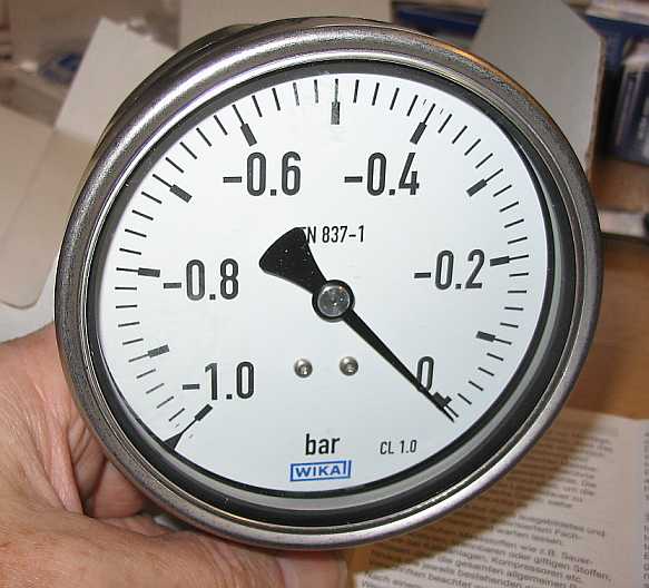 Zur Messung des Unterdrucks bei der Verstellung des Zündzeitpunktes und des Saugrohrunterdrucks bei der KA-Jetronic wird ein genaues Manometer benötigt. Bei der Fa. ESSKA gibt es im Shop die Manometer. Geeignet ist das Manometer MS-1 100C R000, Anschluss G, 1/2 Zoll B, unten, Skalenteilung 0,02 bar, Anzeigebereich -1 bis 0 bar, 100 mm Durchmesser, 64,60 Euro ohne MwSt..