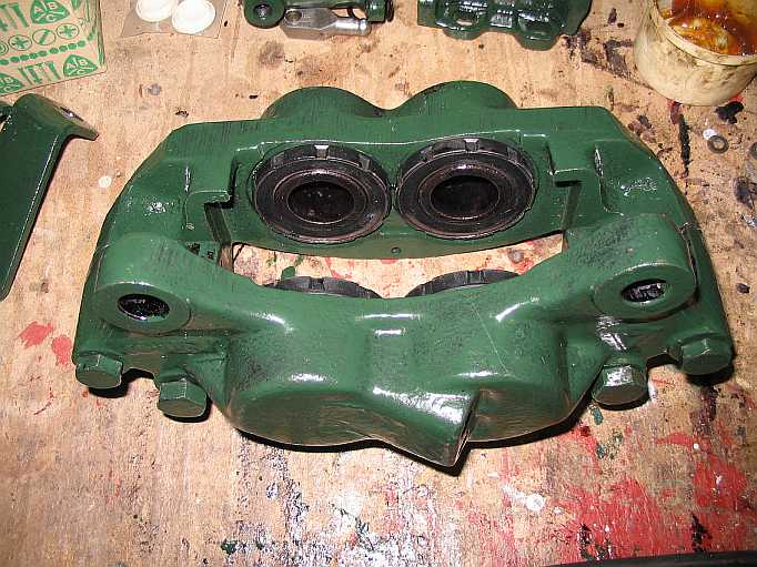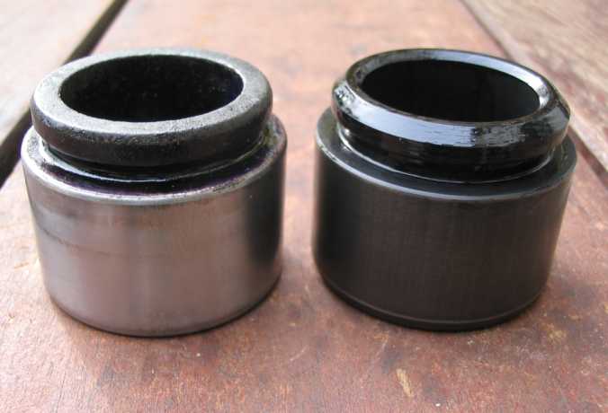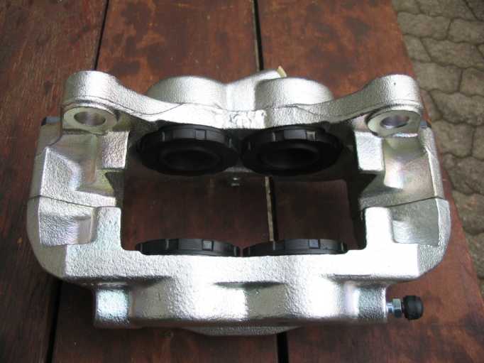 Nur zur Dokumentation: Wie ein Bremssattel zerlegt wird (nur für Wettbewerbsfahrzeuge), ist ausführlich hier beschrieben. Bei den neuen Staubschutzkappen ist der Metallrand (zum Aufpressen, rote Pfeile) nicht korrosionsgeschützt (mit Brunox abdecken). |
