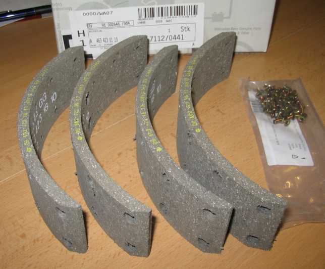 | Als Reparatursatz A4634230110 - 78,67 Euro ohne MwSt. gibt es die vier Bremsbeläge mit den Nieten. Wie die Beläge aufgenietet werden, ist hier beschrieben. beschrieben. Ich gewann mit diesem Tipp bei www.autoschrauber.de einen Satz Schlosserhammer von Peddinghaus. | ![]() |
