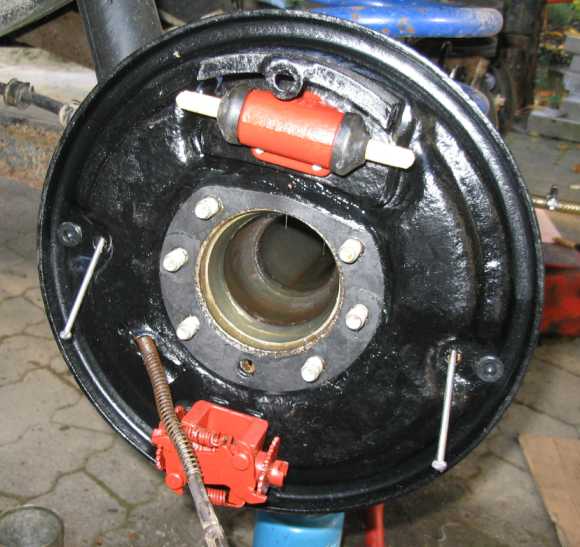 | Die restaurierten Teile vom 240GD passen auch beim 280GE, so der Bremszylinder, die Bremsbacken und der automatische Nachsteller. Auf den lagerichtigen Einbau der Druckstange mit Feder und Federteller achten, siehe auch Einbau beim 240GD | ![]() |