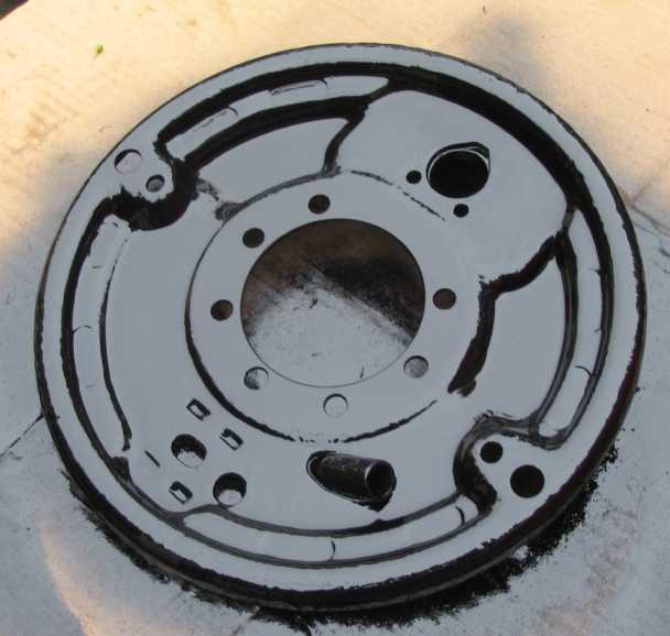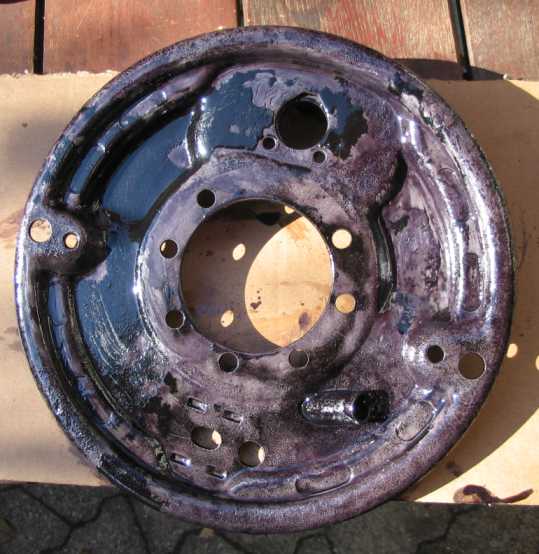 | Nach dem Sandstrahlen muß chemisch noch entrostet werden, d.h. es erfolgt ein zweimaliger Anstrich mit dem Rostumwandler/Grundierung Brunox . Schwarz lackiert sieht die Bremsträgerplatte wie neu aus. Zusätzlich wird noch Korrosionsschutzwachs verwendet. Nun kann sie eingebaut werden. | ![]() |