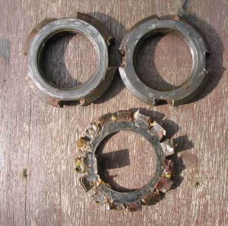 Die Nutmuttern der Radlager wurden mit dem Meissel gelöst bzw. angezogen und sind nun unbrauchbar. Es waren auch zwei verschiedene Nutmuttern eingebaut. Die dazugehörigen Nutmutternschlüssel und die Nutmuttern sind im Tipp Werkzeug beschrieben. Das Spiel im Radlager ist auch viel zu groß, also sind neue Radlager fällig. |