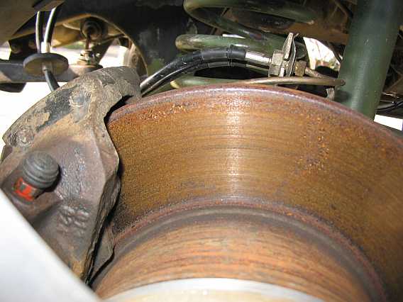Anfang März 2011 machte ich die Bilder von den beiden vorderen Bremsscheiben. Da ist schon ein beträchtlicher Unterschied zu sehen. Die linke Bremsscheibenfläche ist braun, die rechte fast nicht angegriffen.