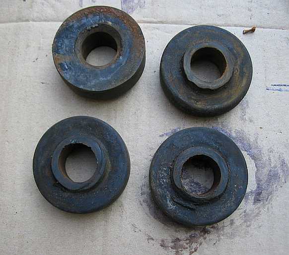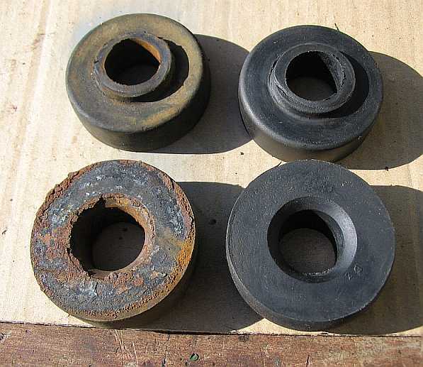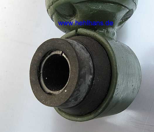 | Die Dämpfergummis können mit einem alkoholischen Rostlöser, der gleichzeitig Gummi pflegt, gereinigt werden. Zuvor kratzt man die Rostrückstände mit einem Schaber ab. Die Schutzrohre werden mit Wasser von den Schlammrückständen im Inneren gereinigt. | ![]() |