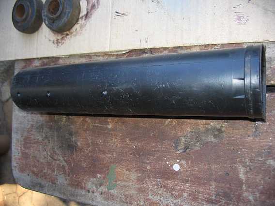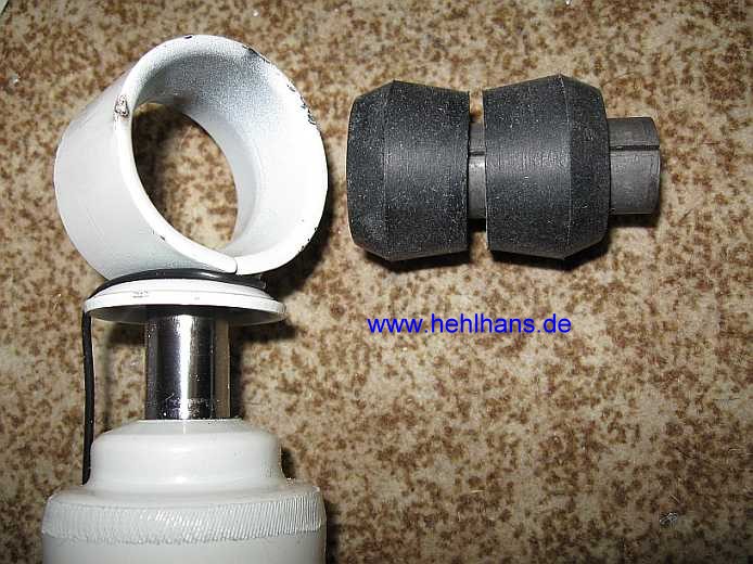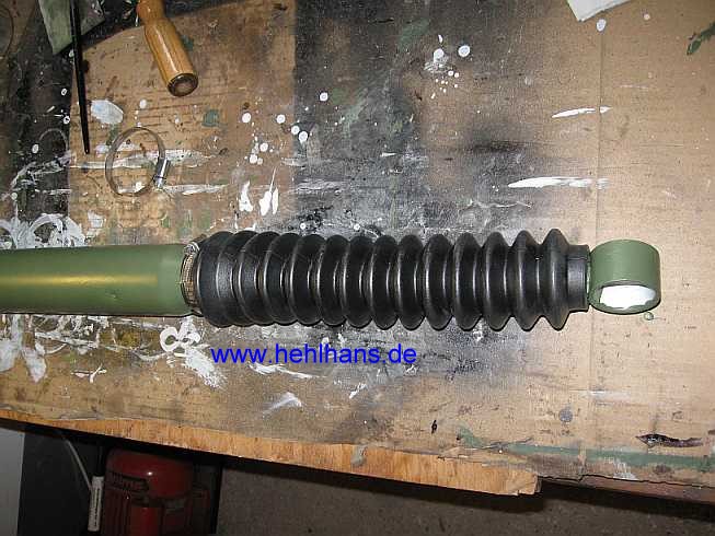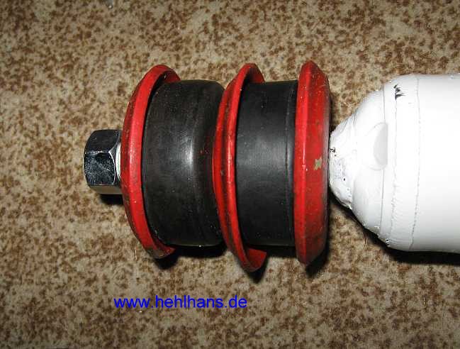 | Den Gummibalg habe ich am Stoßdämpfer mit einer soliden V2A-Schelle (40-60mm) befestigt. Seitlich kommen bei der oberen Öse noch zwei große V2A-Scheiben hinzu. | ![]() |