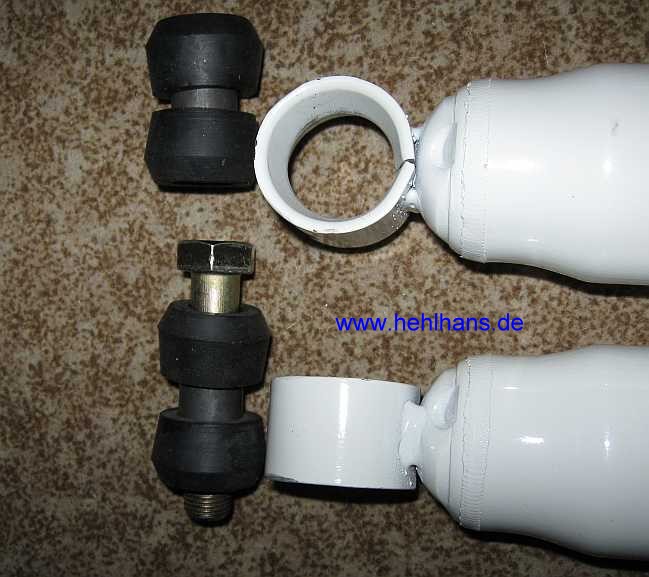 | Die Befestigungsteile für die Schraubbolzen der Stoßdämpfer sind für die großen Löcher der Aufnahmen am Rahmen zu klein. (siehe Tipp Nr. 49 Aufbauteile) | ![]() |