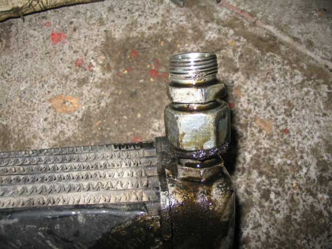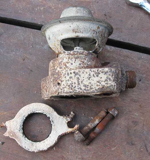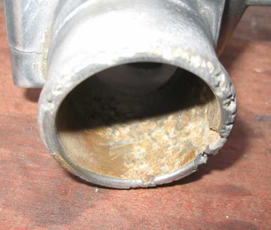 Das Oberteil des Thermostatgehäuses zeigt am Anschlussstutzen schon Innenkorrosion/Lochfraß, wäre aber noch genügend stabil. |