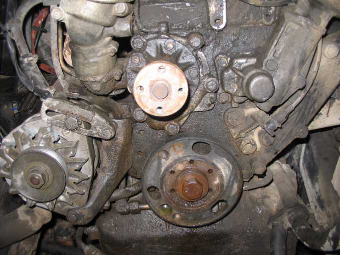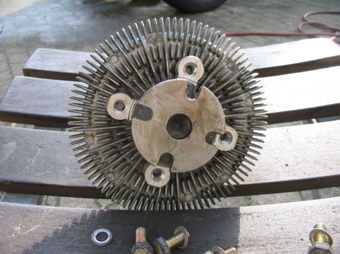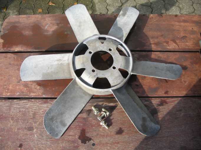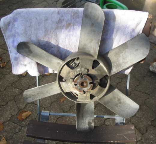 Als ich anfangs September 2009 mal den Lüfterflügel von Hand drehen wollte und das nur mit Gewalt ging, baute ich den über 25 Jahre alten Viskolüfter aus. Die Achse im Lüfterantrieb war fest. So kaufte ich einen neuen Lüfterantrieb. Der Flansch am Antrieb lässt sich nun auch mit der Hand drehen. Bei der TAT 2010 riß von einem Flügel ein Stück ab. |