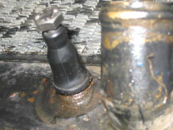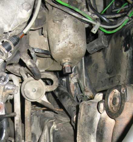 | Nur mühsam konnte ich mittels Spiegel die zwei Schrauben entfernen. Die Mutter erreichte ich vom linken Kotflügelraum aus, über der Bremsleitungshalterung war etwas Platz für die Verlängerung der Ratsche. |