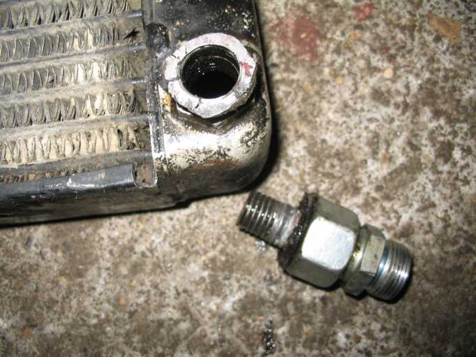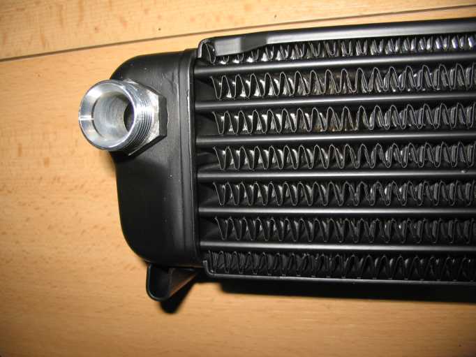 Bei der Fa. Hytec-Hydraulik gibt es die sog. "gerade Einschraubverbindung (metrisch)" nach DIN 2353 mit Schneidring in den Bauformen PL 6-18 mm, 315 bar, 22-42 und PS 6 -14 mm, 630 bar, 16-30 mm 315 bar. Von N. Sollner sind der Tipp und die Reparaturbilder des Anschlusses (Herzlichen Dank, Norbert). Sein Reparaturtipp: Einen Druckluft-Anschluß mit Ermeto Überwurfmutter M 22x1,5 für die intakte Seite bauen, um bei allen später anstehenden mechanischen Bearbeitungen zu gewährleisten, daß keine Späne in den Kühler gelangen. Achtung! Dann unbedingt eine Schutzbrille tragen! Zur Verwendung kommt ein Ermeto Einschraubstutzen von 12 L auf 15 L mit umlaufender Schneidkante. Also eine Gewinde-Größe M 18x1,5 auf M22x1,5. Die umlaufende Schneidkante ( Dichtkante ) befindet sich auf der 12 L Seite. Das defekte Gewinde wird bündig am unteren Ende abgesägt, und plan gefeilt. Die vorhandene Bohrung auf 16,5 mm erweitern.... ( ..Kernlochbohrung für M18x1,5 ), und mit einem Kegelsenker leicht anfasen, dann greift der Gewindeschneider besser. Neues Gewinde M 18 x 1,5 einschneiden. Den Stutzen eindrehen bis die Kante ganz leicht in das Aluminium schneidet. Da die Fläche vermutlich nicht sauber rechtwinklig zur Bohrung ist, muß hier noch nachgearbeitet werden. Die Stellen, an denen die Schneidkante schon eingeschnitten hat, mit der Feile noch etwas weiter schlichten. Wenn es denn sauber paßt und die Kante rundum gleichmäßig einschneidet, den Stutzen letztendlich ( ..mit Loctite ) eindrehen, aber bitte mit sehr viel Gefühl! Das Alu im Kühler ist schnell überdreht. Zum Test hab ich den Kühler dann einseitig mit einem M 22x1,5-Verschluß abgeschlossen und mit 5 Bar Druck beaufschlagt. |