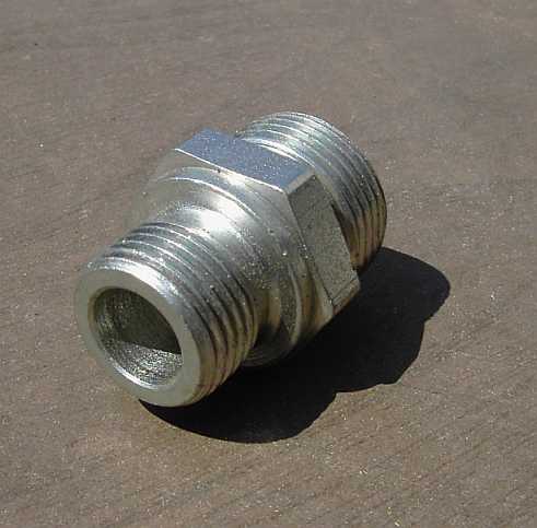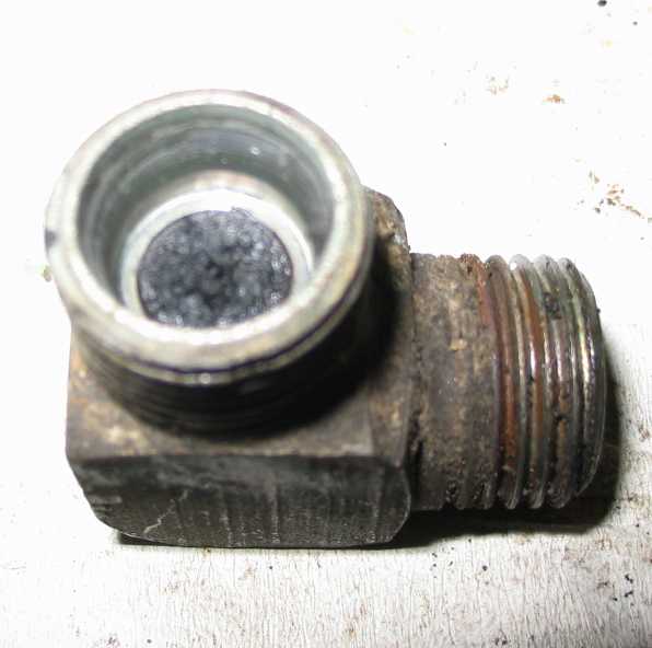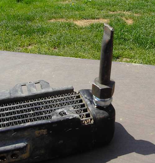 Bild 2: Seitenansicht des Stutzens Bild 3: Stutzen verschraubt. Bild 4: Druckluft-Anschluß zum Ausblasen der Späne während der ganzen mechanischen Arbeiten, sowie dem abschließenden Testen der Dichtheit Bild 5: Der Verschluß zum Prüfen der Dichtheit. Ich habe auf die Schnelle keine Verschluß-Kappe gefunden, also hab ich ein Stück Rohr 15L zusammen gedrückt und verschweißt. |
