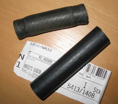 | Der Verbindungsschlauch N900271042012 zwischen Wasserpumpe und Thermostat - 43 mm lang, ist auch nicht mehr der beste. Das Rohrstück ist neu lackiert. | ![]() |