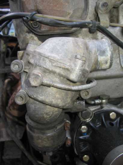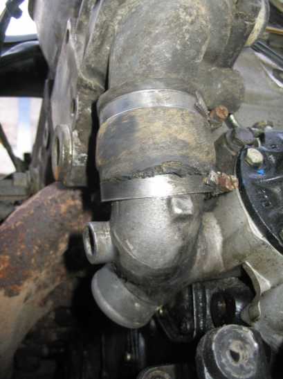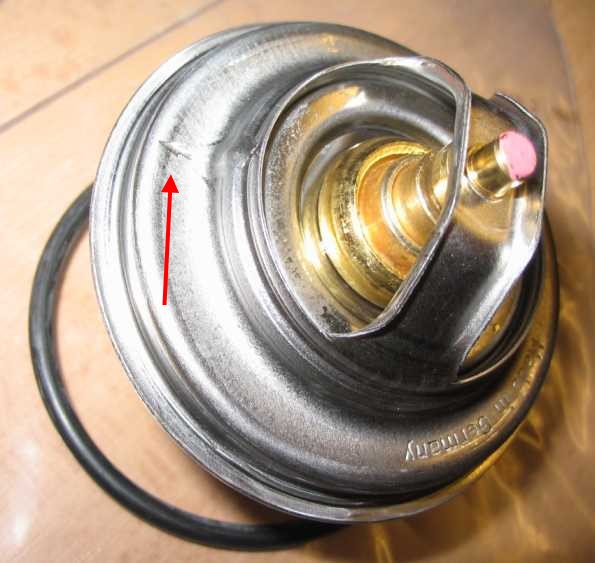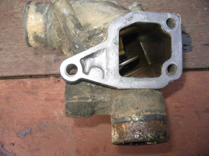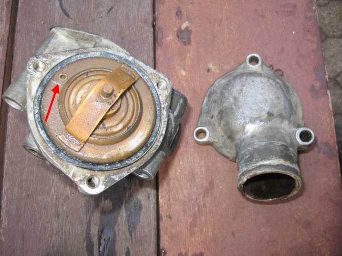 | Wenn sowieso schon der Kühler ausgebaut ist, kann auch gleich der Thermostat mit Gehäuse nachgeschaut werden. Dies war auch notwendig, wie sich herausstellte. | ![]() |