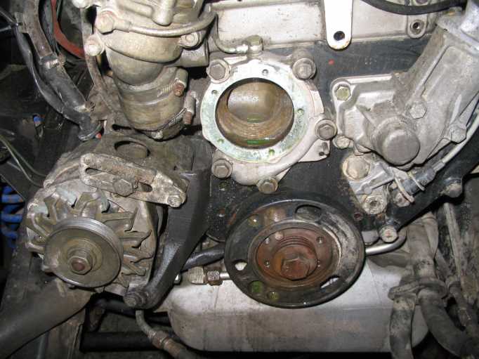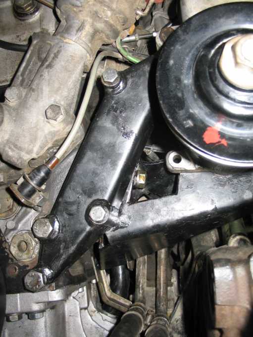 | Nun kommt man von vorne an die Schrauben des Halters. Nach dem Umbau der Innenwand vom linken Kotflügel ist nun alles von zwei Seiten bequem erreichbar (siehe Tipp 98-6, Nr. 2). Die untere Öse der Lenkhilfpumpe war nicht verwendet. Die Pumpe liegt mit der Bodenfläche am Träger auf. | ![]() |