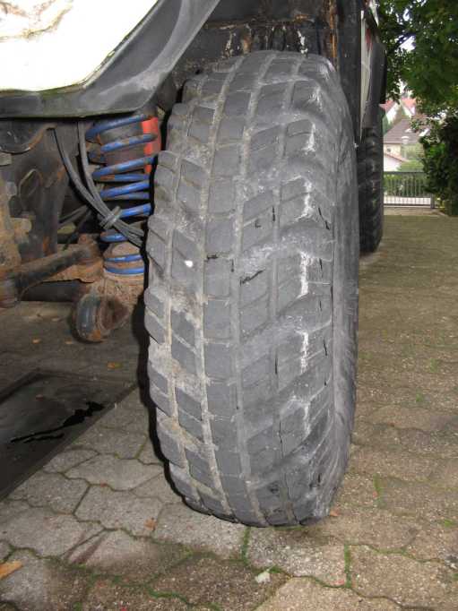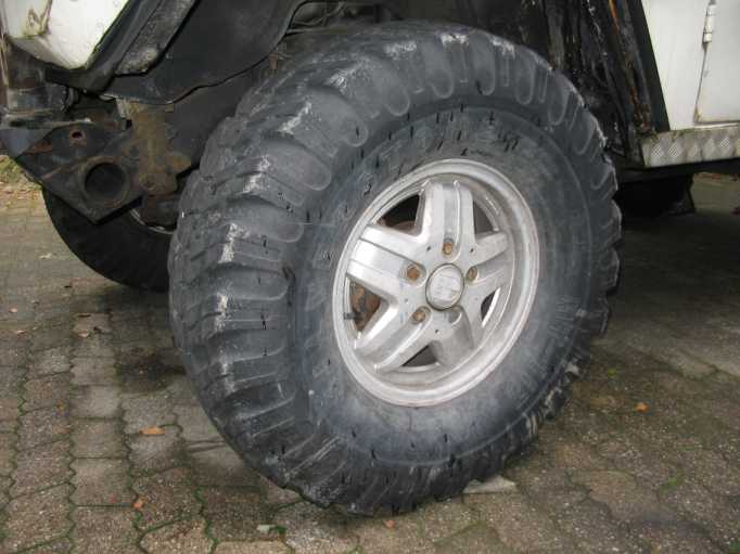 Der 280GE besaß beim Kauf die Reifen Silverstone MT 117, 280/85-16, Tubetype (Reifenhöhe 86 cm) mit der ATS-Alufelge 5 1/2JK16H2 - A4604010102. Das Reserverad war ein Semperit 245-16 Tubetype (Höhe 80 cm) auf Stahlfelge 5 1/2JK16H2. Einzelheiten dazu im Reifentipp. |