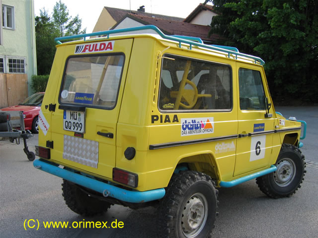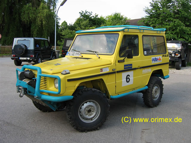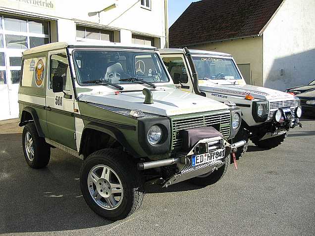 | 2. Es kam anders: Eines Morgens anfangs Juli 2008 bekam ich von meinem Trophy-Freund eine email: bei "3.2.1..meins" wird ein Puch 280GE Baujahr 1984, Standort Salzburg, angeboten (Angebotsende 20.00 Uhr). Der 280GE war schon wettbewerbsmäßig umgebaut (Seilwinde, Bodylift, Schalensitze, Vierpunktgurt, Innentank usw.) und fahrbereit, aber überholungsbedürftig, wie der österreichische Besitzer meinte. Etliche Telefonate später war es klar, wir bieten mit. Und drei Sekunden vor 20.00 Uhr hatten wir mit unserem nur etwas darüber liegenden Gebot Erfolg und den 280GE. |